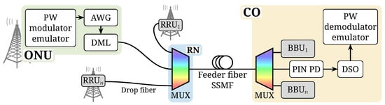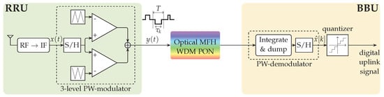 - Parolari, P.; Gatto, A.; Combi, L.; Boffi, P.; Martinelli, M.; Spagnolini, U. Multilevel pulse width modulation fibre optic transmission for next generation mobile fronthaul. In Proceedings of the 42nd European Conference on Optical Communication (ECOC 2016), Dusseldorf, Germany, 18–22 September 2016; pp. 1–3. [Google Scholar]