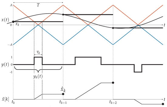 where T is the sampling interval. Demodulation is performed by an integrator that is periodically reset at the end of each sampling interval to obtain the estimated sampled signal . In case of M-PWM with more than three amplitude levels, the integrator needs to be preceded by a decision on the received amplitude level. This is to avoid the amplitude-duration ambiguity that would arise from straightforward integration of the received signal.