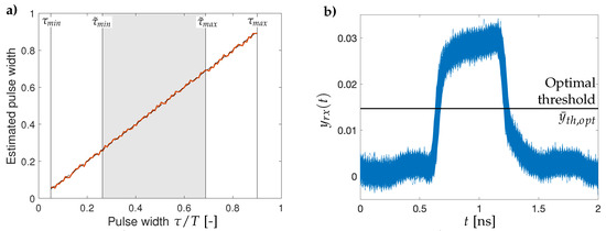 The performance assessment is preceded by a calibration procedure in which a sequence of pulses is transmitted, so that their duration values cover the whole pulse width dynamic. This allows for determining both the optimal threshold level before integrating the received PWM signal and the amplitude-width correspondence of the entire link. An in-field unit would have to repeat the calibration procedure according to the aging dynamics of the optical and electronics devices. An example of the results of the calibration stage is presented in Figure 4: Figure 4a shows the calibration curve obtained for the cases of full and halved duration dynamics. All the received instances of the calibration pulse of duration are displayed in Figure 4b, together with the optimal threshold level . Such optimal threshold is chosen so as to minimize the average noise level of the received calibration signal.