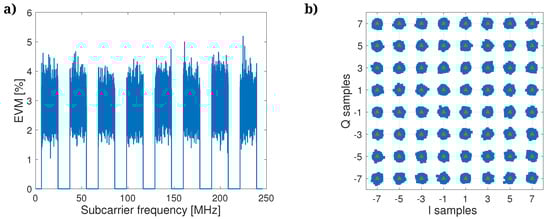 After the calibration step, the M-PWM architecture can be employed for the transmission of LTE-like mobile signals. Figure 5 presents the results for a received optical power dBm, when a 3-level PWM signal with full duration dynamic is used for the MFH. In particular, Figure 5a shows the EVM per subcarrier for aggregated LTE-like 20-MHz signals: each 20-MHz OFDM signal is composed of 1200 15-kHz subcarriers with 64-QAM modulation, plus 848 15-kHz guard subcarriers. Figure 5a shows similar EVM levels for all the 15-kHz subcarriers, thus, in the following results, the average EVM is considered as a performance metric. Figure 5b shows the received 64-QAM constellation per subcarrier.