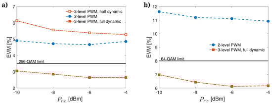 The mean EVM after averaging along all the subcarriers is in Figure 6 for (Figure 6a) and (Figure 6b). Figure 6a compares the performance of the two codes with equal representation dynamics: as expected, the conventional 2-level PWM (full blue circles) performs slightly better than the half-dynamic 3-level PWM (open red squares). Anyways, both modulation formats guarantee an EVM level well below the 8% that is the LTE limit for 64-QAM. A full-dynamic 3-level PWM, on the other hand, results in an average EVM below the 256-QAM limit (3.5%), thus allowing the higher modulation format at least for some of the subcarriers. The difference in performance between 3-level and conventional PWM is even more apparent when considering 16 aggregated channel, as in Figure 6b. In this case, indeed, conventional 2-level PWM cannot satisfy the EVM specifications for 64-QAM, while 3-level PWM achieves an average EVM around 6%.