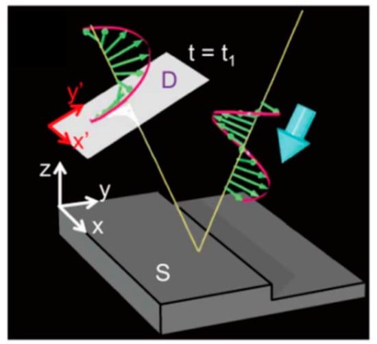 Figure 1 shows the concept of the high-resolution T-ray topography measurement which utilizes the PS THz-TDS in reflection mode (i.e., it measured the polarization information of the terahertz waves reflected from the sample). Here, we illuminate the sample by an elliptically-polarized terahertz pulse whose E-field direction performs one complete rotation within a single optical cycle of the terahertz pulse. The reflected terahertz pulse that has arrived at the detector is probed by the spinning EO sensor method [50] to precisely determine the magnitude and angle of the E-field vector. Because the measured angle of the terahertz E-field depends on the traveling time of the terahertz pulse, the angle contains the height information or topography information of the sample.