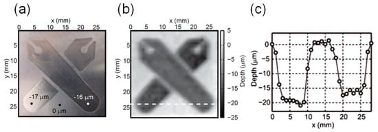 Figure 2 shows an actual T-ray topography image [66]. A photograph of the sample (a machined aluminum board including our university emblem) is shown in Figure 2a. The depth of the emblem on the board is about 17 μm, measured by a digital height gauge. The topography extracted from the PS THz-TDS data is shown by the map in Figure 2b. Figure 2c plots the cross-section of the topography data along the white line in Figure 2b. Obviously, the PS THz-TDS measurement is able to quantitatively trace the height profile of the sample with an axial resolution (~1 μm) much better than the wavelength of the terahertz pulse.