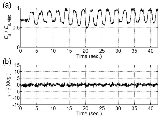 Stability of the extracted polarization direction when using the spinning EO sensor method. (a) Time chart of the intentionally modulated magnitude of the terahertz E-field (normalized by the maximum value); (b) Time chart of the measured angle of the E-field vector, , relative to its mean value . (Reprinted from reference [50] with the permission of AIP Publishing.).