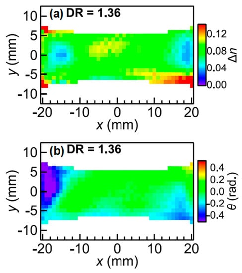 Spatial mapping of (a) the degree of birefringence and (b) the angle of the slow optic axis of a stretched black rubber sample. The draw ratio is 1.36. (Reprinted from reference [83] used in accordance with the Creative Commons Attribution (CC BY) license.).