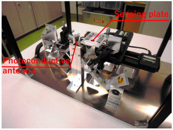 The femtosecond laser pulses were irradiated from the substrate side of the sensing plate and focused on the plate through an objective lens, generating the THz pulses. The incident angle and spot size of the laser pulses was 45° and ~5 µm, respectively. Because of the phased array effect of THz radiation, the THz pulses were radiated into free space in the direction of their reflection. The radiated THz pulses were collimated and focused onto a bow-tie-type photoconductive antenna. To measure the amplitude of the THz pulses, the antenna arrival time of the trigger pulses was fixed at the observed timing of the peak amplitude. For scanning the laser pulses and mapping their amplitudes, the sensing plate was mounted on an x–y movable stage. A photograph of the prototype TCM is shown in Figure 5. Almost all modules were fabricated from aluminum blocks, thereby reducing the number of mechanical components.