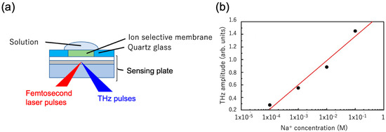 Because the medium contained ETH2120, sodium ions were selectively taken into the membrane. Therefore, the electric potential beneath the membrane responded to the changing concentration of sodium ions in the solution on the membrane. The electric potential and ion concentration are related by Equation (2), which derives from the change in the Gibbs free energy associated with the electrochemical transformation. Figure 7b plots the THz amplitude as a function of sodium-ion concentration in the solution during femtosecond laser illumination beneath the ion-selective membrane. The amplitude of the THz pulses increased as the ion concentration increased from 1 × 10−4 M to 1 × 10−1 M. The sensitivity (estimated from the slope of the linear line) was 0.38/decade and the volume of the measured solution was 470 nL. Currently, we are further reducing the solution volume by fabricating smaller ion-selective membranes.