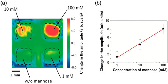Figure 9a shows the amplitude changes in the THz pulses before and after the immune reaction. The antibody solution was D-(+)-Mannose (Man, Fujifilm Wako Pure Chemicals, Tokyo) in HEPES. The concentrations pointed by arrows in Figure 9a are the mannose concentrations in the wells (delineated by dashed lines). Figure 9b plots the amplitude changes as a function of the mannose concentration in the wells on the sensing plate. The sensitivity (calculated by linearly fitting the data points) was 3.3 mV/dec. In general, the sensitivity is changed by changing the alignment of the laser and the laser conditions, so wells containing reference solutions must be integrated into the sensing plate for calibration [22]. The error bars are the standard deviations of the amplitudes in each well. The average standard deviation was 2.4 mV, rather large relative to the sensitivity, but could be improved by improving the signal-to-noise ratio of the THz detectors. The amplitude change increased by increasing the mannose concentration in the dropped solution because the immune reactions conjugated the Con A and Man, thereby altering the electric potential at the surface of the sensing plate. The typical noise level of the obtained THz amplitude was approximately 0.3 mV and the detection limit was calculated as 0.3 mM by extrapolating the linear data fitting.