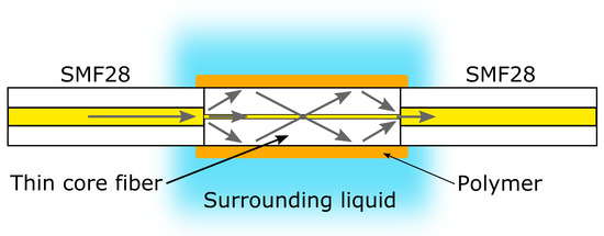 Principle of a single mode-multi mode-single mode (SMS) thin core Mach-Zehnder interferometer. Light from the core of the left SMF28 fiber is coupled to cladding modes in the short (TCF), which can interact with the surrounding liquid depending on the liquid refractive index. For a broadband light source, a constructive or destructive interference pattern is created at the right (TCF)/SMF28 interface, which is guided in the core of the right SMF28 fiber.