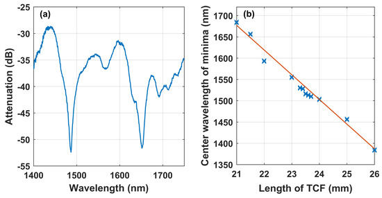 Typical transmission spectrum measured on a TCF inline sensor with a length of 24.2 mm held in air (a) and center wavelength for the left minima in (a) as a function of TCF length (b).