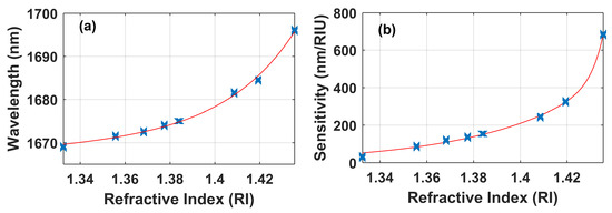 The wavelength of the transmission minima for a 20.0 mm long TCF sensor submerged in solutions with different RI (a) and the sensitivity in nm per RIU as a function of RI (b).