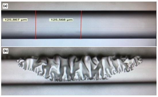 TCF coated with a thin, ∼0.5 m layer of pH-sensitive coating based on 1.3-BDDA and PIP (a). Large volume expansion of the polymer creating problem with adhesion to the glass fiber when the coated fiber is submerged in a liquid (b).