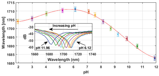The sensor was evaluated in liquids of different pH-levels ranging from 1.89 to 11.89 where the largest sensitivity was observed in the pH range 7–10. The sensitivity for a specific pH range can be adjusted by selecting an appropriate thickness of the hydrogel layer. Care must also be taken to ensure that the measured pH falls within the intended wavelength range. Otherwise, the central wavelength of the transmission minima can represent two different pH values as seen in Figure 8.