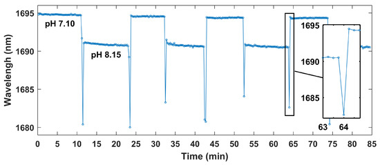A typical result from a pH-level cycling measurement is shown in Figure 10, where the sensor is repeatedly submerged into liquids with pH-level 7.10 and 8.15. The response time of the sensor is less than 15 s, which is the highest acquisition rate of the optical spectrum analyzer (OSA). The sharp dips between the different pH-levels originates from the short time (less than 20 s) the sensor is held in air, due to changing of the pH-liquid. The short response time is due to the relatively thin coating layer on this sensor. Sensors with thicker coating layers, i.e., >1 m typically have response times in the order of minutes (not shown). For this reason, a thin (<1 m) coating layer is clearly an advantage.