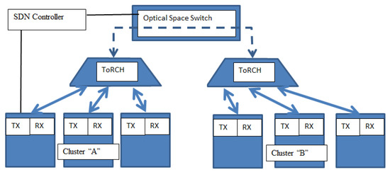 In this paper, though, we consider a case where the ToR switches are equipped with a number of optical interfaces, one of which can be diverted from the normal Leaf-Spine network and directed towards our new network based on the OSS. This special interface is also equipped with a fast tunable laser that can be set to any of the possible Wavelength Division Multiplexing (WDM) channels in the all-optical network. The ToRs are arranged in clusters, where each ToR Cluster (ToRC) contains a few tens of switches and the OSS can be reconfigured to create a transparent optical path between a pair of these clusters.