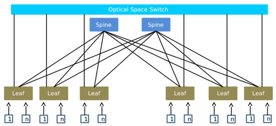 Nowadays, the two most common network topologies deployed in DCs are the Fat Tree and Leaf-Spine network topologies due to their ability to interconnect large numbers of servers efficiently [2,3]. However, with increasing demands on the computational power of the DC, the DC network is one of the main bottlenecks that affects the overall performance of the DCs. To handle this demand, several research studies have introduced network extensions to the DC backbone network using optical space switches. These extensions deploy optical space switches to directly connect the Top-of-Rack(ToR) switches between each other. This approach provides a set of reconfigurable links that can be used to offload traffic between hot spots in the DC and reduce the load on the DC’s backbone network.