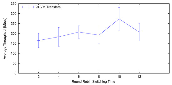 The duration of the SSE was varied for the UT scheme and the average throughput of 24 concurrent VM transfers was measured. The results shown in Figure 3 indicate that the maximum throughput is achieved when the SSE is set to 10 s. This value is used throughout the rest of this study.