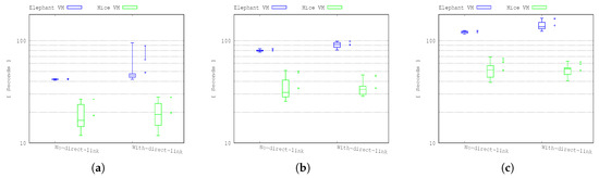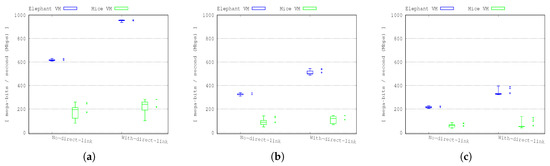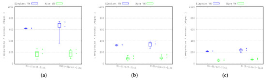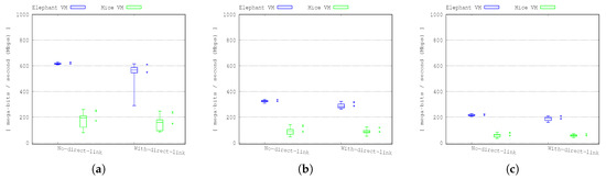 Throughput for elephant and mice VMs in the 24 (a), 48 (b) and 72 (c) VM transfer scenarios. To the right of each boxplot, we show the mean and a whisker marking the 95th and 99th percentiles.