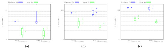 Completion time for elephant and mice VMs in the 24 (a), 48 (b) and 72 (c) VM transfer scenarios. To the right of each boxplot, we show the mean and a whisker marking the 95th and 99th percentiles.