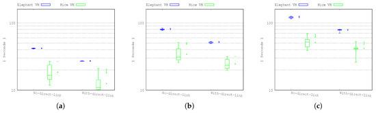 As shown in the figures, the elephant VM transfers always performed worse in the case of deploying the direct optical link extended topology compared to the DCN without the direct optical link extension. In the mice VM transfer scenarios, the performance is almost the same as the error bars of the two cases that overlap. A detailed inspection of the results indicated that this behaviour was due to packets being held in a buffer for a link that had been removed due to the movement of links in the reconfigurable network case. This resulted in repeated slow-start TCP behaviour on both types of flows, which had a disproportionately severe impact on the elephant flows as stalled transmission of the mice flows could cause additional delays to the elephant flows.