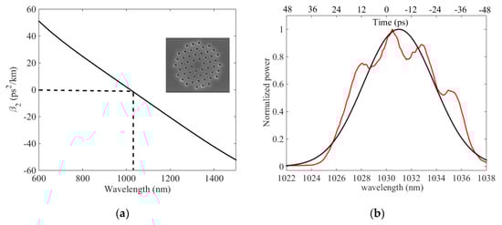 with β20 and β40 the second and fourth order dispersion terms at the pump wavelength λp. We neglected higher order terms. Ω is the angular frequency offset from the pump. γ is the nonlinear coefficient of the fiber and is set to 35 W−1 km−1. In order to calculate the phase matching condition (Equation (1)), we considered the photonic crystal fiber (PCF) used in the experiment. From the input facet of the PCF measured with a scanning electron microscope (SEM, inset in Figure 1a), the second order dispersion term as the function of the wavelength was calculated (Figure 1a). The SEM image was first, turned into a two-color image that represented the refractive index map. A mesh was then created from this index map and both effective indices and intensity distributions of electric and magnetic fields were then calculated using a commercial mode solver based on the finite element method. The chromatic dispersion curve was simply deduced from the effective index one, leading to the determination of the zero dispersion wavelength (ZDW) at 1020 nm.