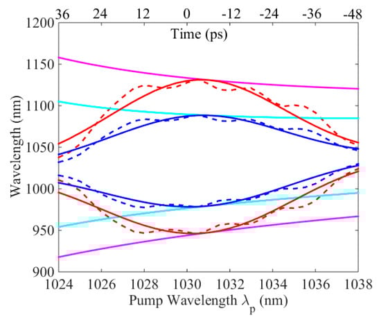 For comparison, we firstly calculated the phase matching condition as a function of λp for a constant peak power of 600 W (Figure 2, magenta solid lines) and 200 W (Figure 2, cyan solid lines). In both cases, the phase matched wavelengths evolved monotonically with λp. Since we aimed to investigate the impact of the pulse shape of a chirped pump, the instantaneous power P was time dependent in the following. For example, the spectral profile of the pump that originates from an ultra-fast laser has usually a Gaussian profile. In our configuration, the pulse was stretched with a linear chirp rate α = τ/(λp − λp0), with λp0 as the pump central wavelength. Therefore, the temporal profile also had a Gaussian profile. Figure 1b (black line) displays a spectrum centered at λp0 = 1031 nm with a bandwidth equal to 6 nm at Full Width at Half Maximum (FWHM). The full pump spectrum is lain in the anomalous dispersion regime of the PCF. For α = 6 ps/nm close to the experimental value, the pulse duration was 36 ps. Figure 2 shows the phase matching condition calculated from Equation (1) for the Gaussian pump profile with a maximum power of 600 W (red solid line) and 200 W (blue solid line) at 1030 nm.