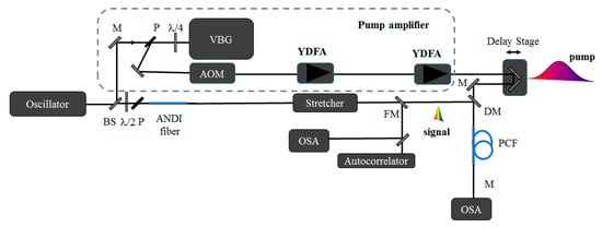 The experimental setup is displayed in Figure 3. The pump and the signal were both generated from a unique mode-locked oscillator (Flint, LightConversion, Vilnius, Lithuania) delivering a train of pulses at 76 MHz with a duration of 80 fs at FWHM centered at 1030 nm. The total average power was 1.5 W. The pump wavelength was set at 1030 nm, while the signal one needed to be tunable in order to seed the targeted parametric amplification band. In order to shift the signal spectrum, a beam splitter selected a part of the oscillator output and 400 mW was injected into an all normal dispersion fiber (ANDI) to generate a coherent continuum []. It extended from ~750 nm to 1250 nm and, therefore, it could be used to seed a parametric amplifier in this band. Then, the continuum was injected into a Öffner type stretcher. The selection of the signal wavelength was achieved by the stretcher alignment by rotating the grating. The spectral bandwidth was imposed by the finite size of the mirrors in the stretcher. The other part of the oscillator (around 750 mW) seeded the pump amplifier. It was composed of a volume Bragg grating (VBG) that stretched the pulses to a duration of few tens of ps. The chirped pulse was then injected into an acoustooptic modulator (AOM) to decrease the repetition rate to 1 MHz and amplified by two ytterbium doped fiber amplifiers (YDFA). The maximum average power was 1 W. Finally, the pump and the signal were both injected into the 5-meter-long PCF. The properties of the PCF were described in Section 2. The two pulses were synchronized with a delay stage and the amplification spectrum was measured with an optical spectrum analyzer (OSA) for several delays. As the signal was shorter than the pump pulse, the instantaneous gain was measured for a selected part of the pump.