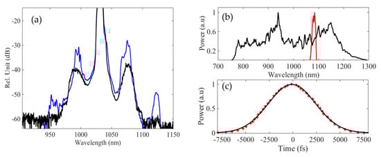 The spectrum at the PCF output was firstly measured with the OSA for an average pump power of 31 mW, when the signal was not injected (Figure 4a). It showed two lobes at 992 nm and 1077 nm, together with the pump spectrum at 1030 nm. The bandwidth at 1077 nm was ~12 nm. The experimental pump spectrum is shown in Figure 1b (red line) and exhibited structures due to self phase modulation (SPM) occurring in the last YDFA. Therefore, we expected that this spectral modulation would impact the temporal distribution of the spectral gain. In the next section, the signal was injected into the PCF together with the chirped pump pulse. Therefore, the continuum (black line in Figure 4b) was filtered in the stretcher to select the signal spectrum at 1080 nm (red line in Figure 4b) close to the central value of the lobes (Figure 4a). The spectral bandwidth was 15 nm (FWHM). The duration of the stretched pulse was measured with an autocorrelator and the experimental trace is shown in Figure 4c (red points). From a Gaussian fit (solid black line in Figure 4c), we deduced a pulse duration of 4.2 ps. This pulse duration is a good compromise, since several constraints need to be considered. Indeed, a very short pulse allowed us to get a high temporal resolution in the pump-probe measurement. However, in this case, the signal pulse can produce SPM even for a low power. For a longer pulse duration, the chirp from the stretcher should also be taken into account in the gain analysis, since the signal wavelength will be distributed in the temporal domain. In our case, we assumed that the signal chirp was negligible compared to the one of the pump, since the signal duration was shorter by a factor >10.