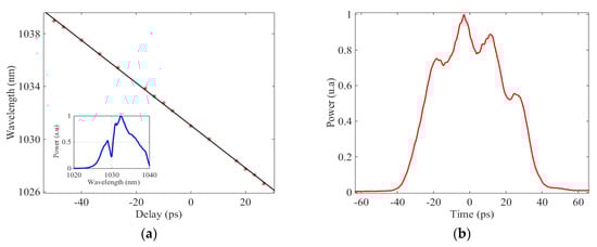 For each delay between the long chirped pump and the short probe, the signal (the probe) overlapped with one slide of the pump, owing to an instantaneous power and wavelength. Therefore, it was highly important to measure the temporal distribution of the pump wavelength. We measured the chirp rate, corresponding to the spectral phase, by spectral interferometry between a long and a short pulse both at the pump wavelength []. Accordingly, we modified the set-up. Briefly, a part of the output of the amplifier was injected at the opposite side of the VBG to recompress it to ~300 fs. Then, the chirped pump and the compressed pulse were combined with a beam splitter and the interference pattern was recorded with the OSA. Due to the finite resolution of the spectrometer, the complete interference pattern could not be measured over the full spectrum. Therefore, a local fringe was measured directly at the null delay between the two pulses. For more details, we refer the reader to the reference [] describing the method. For example, the inset in Figure 5a displays an example of the interference pattern occurring at 1030 nm. In order to get the chirp rate, the spectral location of the fringe was measured as a function of the delay between the long and short pulses (Figure 5a). The null delay was fixed at 1030 nm. From a linear fit, we deduced a α value of 6.2 ps/nm, i.e., the pump wavelengths evolved linearly with time. Combining this value with the spectrum (Figure 1), the temporal shape could be inferred (Figure 5b). The pulse duration was 55 ps (FWHM) and the temporal shape was modulated with a period of ~14 ps.