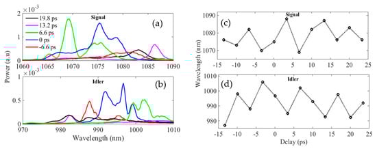 (a,b) Selection of amplified and idler spectra when the delay is tuned from −6.6 ps to +19.8 ps. (c,d) Variation of the signal and idler wavelengths at the maximum amplification as a function of the delay.