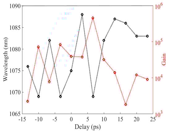 The null delay corresponded to the pump wavelength of 1030 nm (Figure 5). However, we could not accurately define it and we set it when the amplification was at its maximum near the center of the signal spectrum (blue line in Figure 6a). For each Δτ, the amplification clearly occurred at a selected wavelength. In addition, the amplified shapes and their bandwidths varied with Δτ since the signal pulse overlapped with a different portion signal of the pump. Therefore, the pump power and the dispersion at the pump wavelength changed with the delay and influenced the properties of the amplified signal, as explained in Section 2. Particularly, the pump temporal shape was modulated around Δτ = 0 ps and had a Bell shape (Figure 5b). Therefore, the variation of the wavelengths at the maximum amplification with Δτ (Figure 6b) was not monotonic and was modulated. The amplification of one given signal wavelength could be achieved at several delays. This behavior is significantly different from the case in which the chirped pump has a constant peak power since only the dispersion parameter changed with time. In this case, the wavelength at maximum amplification evolved monotonically [].