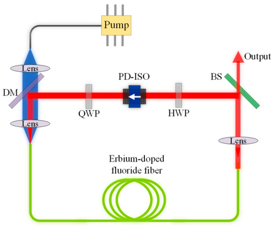 The schematic diagram of the NPR passively mode-locked Er3+-doped fluoride fiber laser based on NPR is shown in Figure 1, which is the same cavity configuration as is involved in [20,21]. The ring cavity consists of an Er3+-doped fluoride fiber, a quarter-waveplate (QWP), a half-waveplate (HWP), a polarization-dependent isolator (PD-ISO), a dichroic mirror (DM), and two focus lenses. In this cavity, the Er3+-doped fluoride fiber is pumped by a 976 nm laser diode. The NPR component, consisting of a quarter-waveplate, a half-waveplate, and a polarization-dependent isolator (PD-ISO), functions as an artificial SA for mode-locking. The PD-ISO also acts as a polarizer and ensures unidirectional transmission in the ring cavity.