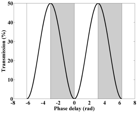 where nx − ny represents the linear birefringence, Δnx and Δny are the nonlinear refractive indexes, and (|u|2 + |v|2) is the light power in the cavity. According to Equations (4)–(7), the transmission of the fiber cavity can be calculated. The relationship between the intensity transmission Ti and the total phase delay Δφ is plotted in Figure 2 for θ = 0.125π and ϕ = 0.625π. Since NPR is equivalent to an artificial saturable absorber and the relationship between ΔφNL and light power is in negative correlation, the Ti increases with the light power before saturation, so we must ensure the total phase delay located at the shadow regions so as to guarantee the laser operated in the positive feedback regime.