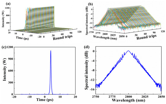 Pulse (a) and spectrum (b) evolution with round trips. Output pulse profile (c) and spectrum profile (d) in the 120th round trip.