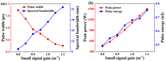 The influence of the small signal gain on the output characteristics of the NPR mode-locked Er3+-doped fluoride fiber laser was also investigated. In the simulation, the fiber length was set to 5 m. According to the simulations, stable mode-locking cannot be achieved when small signal gain below 0.8 m−1. When small signal gain beyond 0.8 m−1, stable uniform soliton mode-locking can be obtained as long as the small signal gain is not exceeding 1.1 m−1. The output properties of the soliton pulses for the small signal gain varying from 0.8 to 1.1 m−1 are summarized in Figure 5. From which we can see the pulse width decreases while the peak power and pulse energy increases with the small signal gain. The narrowest pulse width of 500 fs is obtained for g0 = 1.1 m−1, with the corresponding peak power and pulse energy of 1.5 kW and 0.75 nJ, respectively. For this small signal gain range, the TBPs are calculated to be ~0.4.