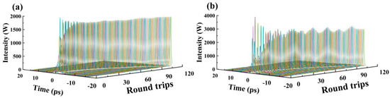 Figure 6a depicts the soliton pulses evolution with the increase of round trip for g0 = 1.15 m−1, from which we can see periodical slight intensity fluctuations appear on the output soliton pulses, namely, the output solitons are no longer uniform. Further increasing the small signal gain, these periodical intensity fluctuations on the output soliton pulses become more prominent, and the modulation period reduces as shown in Figure 6b, in which the small signal gain is set to 1.5 m−1. In this case, narrower pulse duration of ~300 fs with higher peak power of ~2.5 kW of the solitons can be achieved. The periodical intensity fluctuations can be explained by Figure 2. Even when the laser cavity is initially biased to the positive feedback regime, it will switch to the negative feedback if the soliton peak power is overlarge. In this case, the positive feedback and negative feedback will appear periodically and, hence, the soliton pulse intensity in the laser undergoes periodical variation. There are two schemes that can suppress the periodical intensity fluctuations [25]: One is controlling the pump power below the feedback switching threshold and the other is appropriately adjusting the linear polarization bias to a position where the feedback switching threshold is higher. We would like to mention that multiple solitons will be generated by further increase of the small signal gain.
