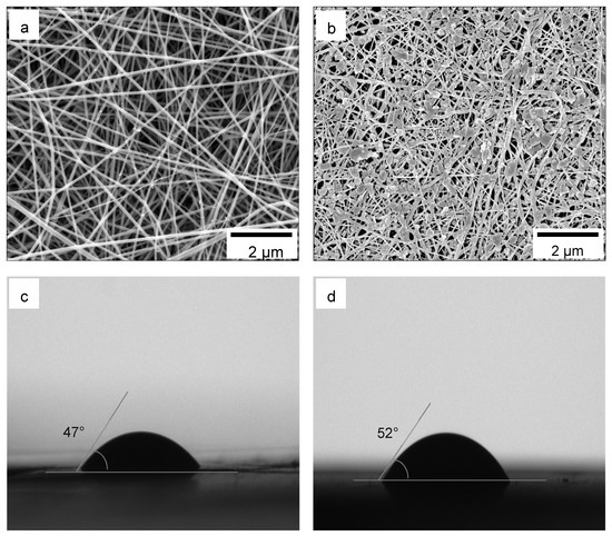 Scanning electron microscopy (SEM) images and photographs of water contact angle measurement of (a,c) polyamide (PA6) and (b,d) PA6-MoS2 nanofibrous membranes.