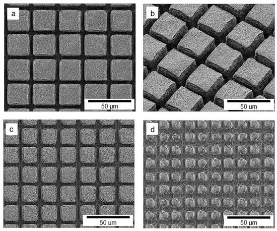 Patterns were created onto the sample surface using optimized laser ablation parameters (20 nJ and 50 µm/s). An array of micro-square pillars was produced, with periodicities of 40, 30, and 20 µm, 4 µm high (which value was obtained by atomic force microscopy measure), and a spacing of 7.8 µm between them. The SEM image of the micro-square pillars with 40 µm, created by fs-laser ablation, is shown in Figure 5a (top view) and 5b (tilt angle of 45°), revealing the high resolution achieved by the fs-laser processing. It is important to mention that a decrease in periodicity led to a decrease in resolution with the appearance of many irregularities, as shown in Figure 5c,d for the periods of 30 and 20 μm, respectively.