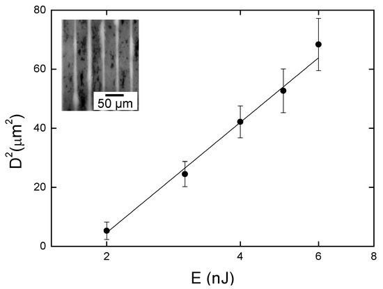 Squared line width as a function of the pulse energy for 50 µm/s of translation speed. The inset shows an optical microscopic image of fs-laser micromachined lines using 5 nJ, in which the white lines represent the removed (laser–ablated) material and the gray regions correspond to the remaining material.