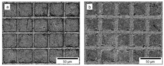 Therefore, two methods can be employed for the production of the patterns on the nanofibrous membranes: the first is by modifying the PA6 nanofibers with MoS2 before laser microfabrication (DBM), while the second one consists in modifying the nanofibers with MoS2 after microfabrication (DAM). Thus, for both approaches (DBM and DAM), matrices of micro-square pillars with a periodicity of 40 µm, 4 µm high, and a spacing of 6.3 and 7.8 µm between the pillars were produced. The SEM images of the micro-square pillars with 40 µm created by fs-laser ablation using DBM and DAM are shown in Figure 7a,b, respectively. From these images, one can see an increased resolution relative to the width of the lines, yielding to regular structures on the nanofibrous membranes, when the modification with MoS2 was performed before the microfabrication (DBM).