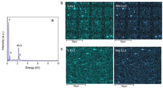 Typical EDX spectra and chemical element composition analysis of the surface of the microstructured pillars using both approaches (DBM and DAM) are shown in Figure 8. The chemical composition analysis reveals that the sample stoichiometry after fs-laser irradiation is the same as the original, with the S/Mo atomic ratio being 2.03, in agreement with the stoichiometry of MoS2. Figure 8b,c present the mapping of backscatter images of the main elements present in samples micromachined using DBM and DAM microstructures, respectively. The mapping of the S and Mo elements for the DBM sample (see Figure 7b) indicated a uniform distribution of such elements. It is possible to observe a smaller amount of material in the laser line, as expected by the ablation of the material. In Figure 8c (DAM), we observed a homogeneous distribution of Mo and S on the sample surface, as expected, once the modification with MoS2 was performed on the entire surface of the material after micromachining.