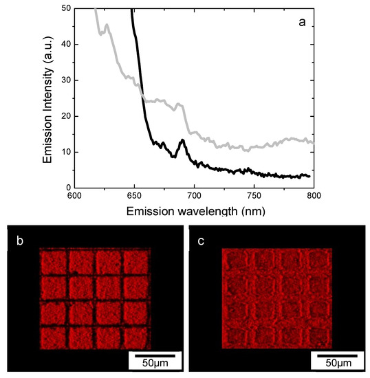 Figure 9a shows the photoluminescence emission spectrum of the MoS2-modified PA6 nanofibrous membranes at two different excitation wavelengths, 575 nm (gray line) and 639 nm (black line), both measured at room temperature. The observed luminescence emissions, called A and B excitons, arose from the direct excitonic transitions at the K point of the Brillouin zone [49,50,51]. The emission peaks at 690 nm and 627 nm correspond to the energy of 1.79 eV and 1.97 eV, respectively, which is quite consistent with the absorption displayed in Figure 2. Figure 9b,c show confocal fluorescence microscope images obtained using laser excitation at 639 nm for DBM and DAM microstructured surfaces with a periodicity of 40 µm, respectively.