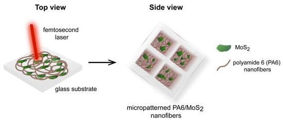 Schematic representation of molybdenum disulfide (MoS2)/polyamide electrospun nanofibrous membranes, micropatterned using femtosecond (fs) laser ablation.