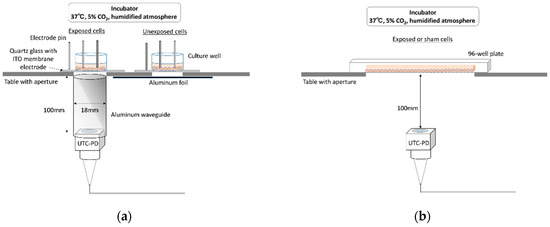 We investigated the viability of cells exposed to THz waves during cell proliferation. A 96-well plate (THz wave permeability of 90%; Corning, Corning, NY, USA) was used for the cell culture. To ensure consistency in the measurement between the exposed and sham cells, two incubators of the same model were used, one for each group (Figure 1b).