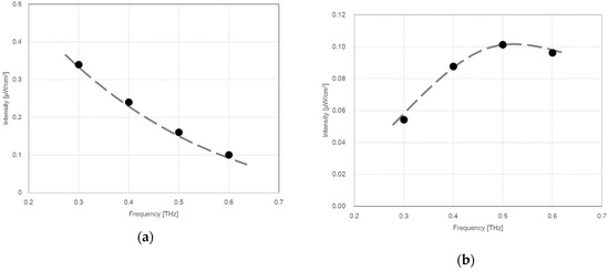 A UTC-PD (NTT Electronics Inc., Yokohama, Japan) was used as the millimeter-wave/THz-wave source. This wave source generates tunable continuous waves, from 10 GHz to 2 THz, by photomixing two wavelength-tunable laser diodes of approximately 1.55 µm on the photodiode [27]. In this study, the wave source was placed in the incubator (positioned approximately 100 mm below the culture well) and the beam divergence angle was adjusted using a silicon lens [28] to ensure that the entire bottom of the well was irradiated (Figure 1a,b). Figure 2 shows the frequency dependence of the irradiation intensity inside the culture well (a) and 96-well plate (b). The frequency range of the irradiated THz waves was 0.3–0.6 THz. In the case of the culture well, the irradiated THz wave covered the well through an aluminum waveguide, with an intensity less than 1 μW/cm2, including both coupling and propagating loss by the waveguide and an absorption loss by the bottom of cell. In the case of the 96-well plate, the irradiated THz wave covered all of the 96 wells through free space, with the intensity approximately 0.1 μW/cm2, including absorption loss by the bottom of the well.