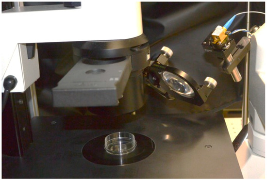 We devised a simple method for irradiating the dishes with THz waves from above to observe cell morphology. To irradiate from the top of the dish, the irradiation system was constructed on the inverted microscope stage (Figure 3). The irradiation light from the UTC-PD was converged in a lens (Tsurupica; PAX Co., Sendai, Japan). The irradiation intensity was estimated from the output of the light source and the beam diameter on the dish to be 4.1~5 µW/cm2 at 0.3–0.6 THz.