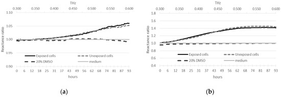 Figure 4 presents the cell growth curve based on the AC impedance measurement method for each cell line. We observed that cells exposed to 0.3–0.6 THz waves for 94 h exhibited no difference in terms of proliferation compared to cells not exposed to these THz frequencies (average of three independent experiments [SD: 0.00–0.16]). The reactance ratios did not show a significant difference between the exposed and unexposed cells; p = 0.51 (NB1RGB) and 0.48 (HCE-T), respectively. Comparing the reactance ratios at each irradiation frequency, no effect on cell proliferation attributable to a specific frequency could be identified. Cell growth was observed for both exposed and unexposed cells, however, those treated with DMSO did not grow. No differences between exposed and unexposed cells were identified (Figure 5).