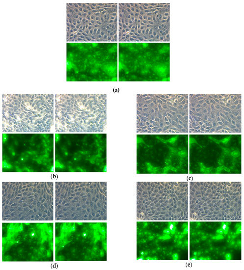 Fluorescence microscope and phase-contrast microscope observations showed that the cell shape and cell membrane did not change on irradiation at 0.3, 0.4, 0.5, and 0.6 THz (Figure 7). No differences due to the THz frequency (0.3–0.6 THz) were seen. Cells were obviously damaged by heating. The cell shapes changed, and the cells peeled off the dish bottoms (Figure 8a). With the addition of 30% DMSO, cells were damaged, and their nuclei were contracted (Figure 8b).