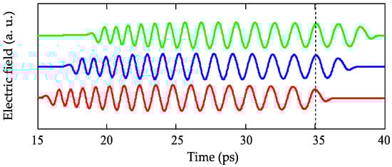 Using Equation (5), the calculated THz waveform in the crystal with l1 = 90 µm, δ = 1.6 µm, and σ = 0.4 ps is shown in Figure 2. Also, in the same figure, we present the THz waveforms obtained for pump pulses delayed at Δtm = τ2m-1 − τ1 for m = 2 and m = 3, respectively. It is seen that there is a temporary overlap of the fields generated by the first positive domain k = 1 and the third (the fifth) domain, if they are excited with delays Δt2 (Δt3), respectively.