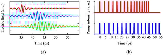 The above statements are illustrated in Figure 3a, where using Equation (6), we present the temporal forms of THz pulse EΣ(tr), excited by the sequence of pulses having delays Δtm (m = 1, 2, 3…16) for cases of δ = 1.6 µm, δ = 0.8 µm, and δ = 0.5 µm, respectively. The required sequence of laser pulses is schematically illustrated in Figure 3b for cases of δ = 1.6 µm and δ = 0.8 µm, respectively.